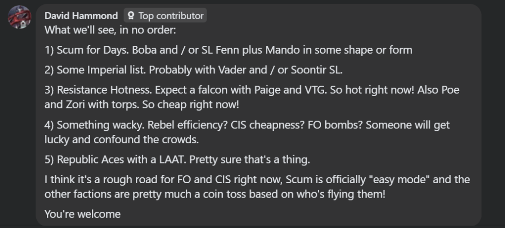 Point 5 was pretty right as well. Although there were only 13 Republic lists, pretty much all of them had aces and LAATs in them… although Nic Firecast (best performing Republic player over the weekend) dropped the LAAT for a second Arc.