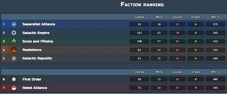 - Rebels had the lowest win rate (34%). This is really interesting, since Rebels have some strong pieces and are usually pretty solid.